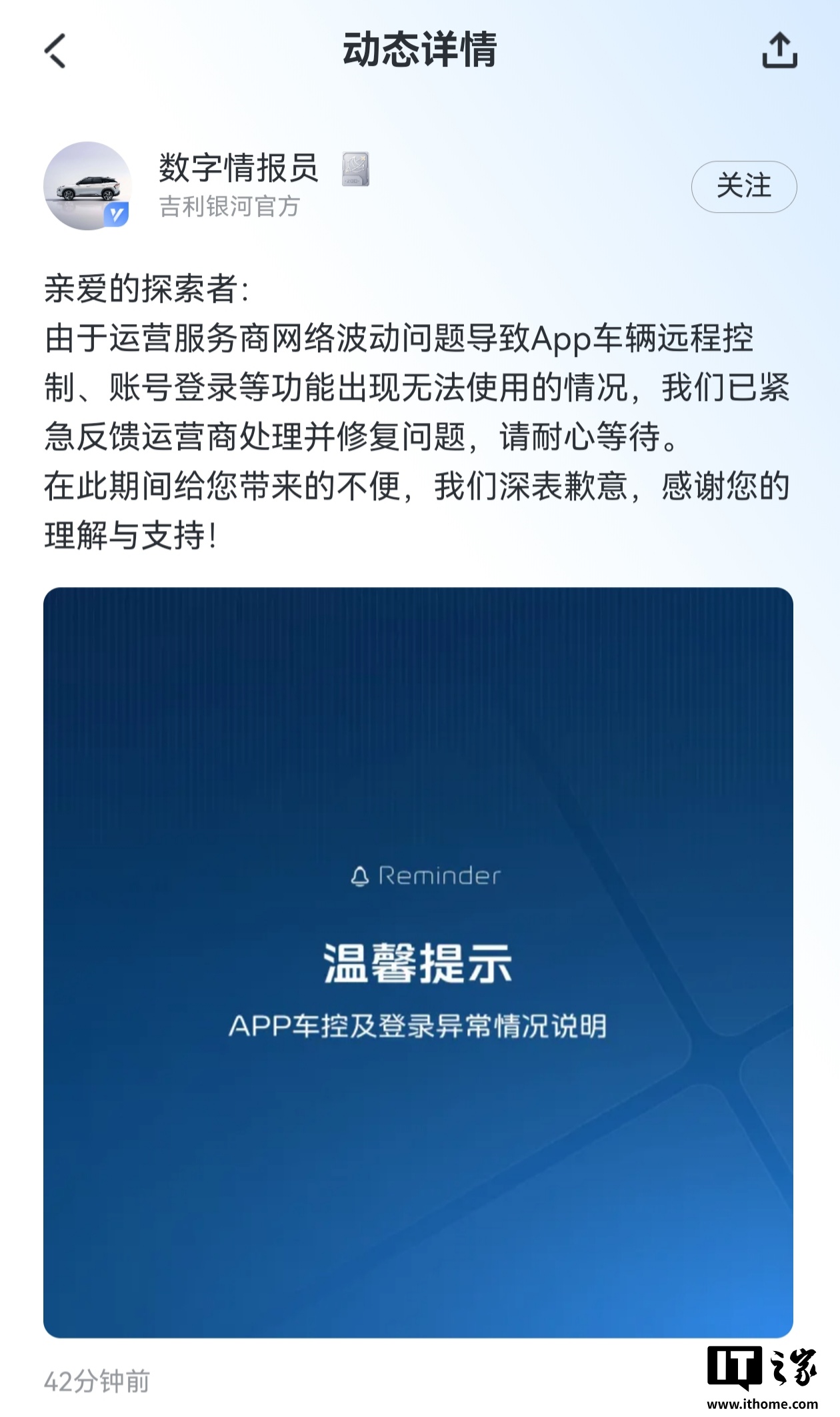 吉利银河官方在社区发布公告称: