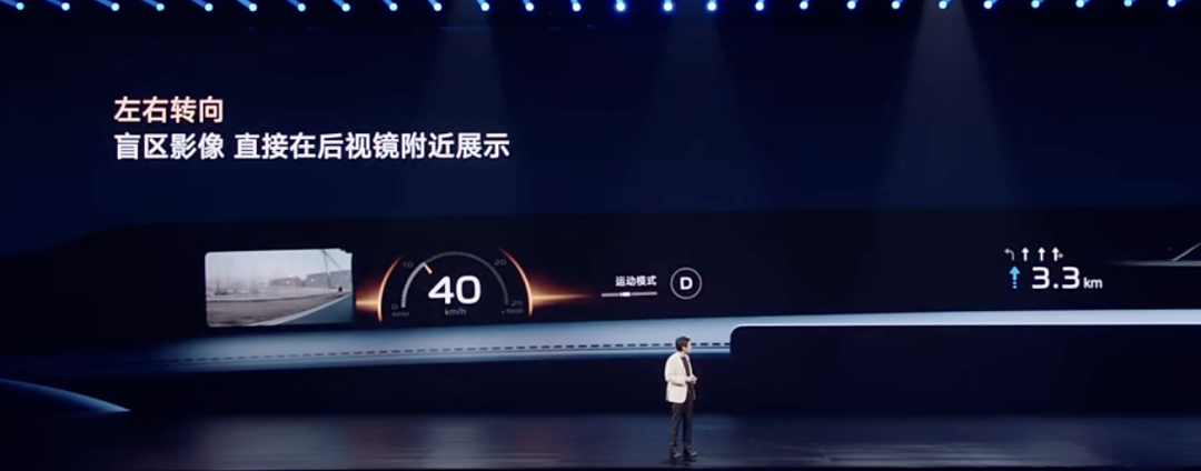 前排座舱增加了“天际屏”,1.1米超宽显示,应用了全景全面投影技术,雷总介绍“不是简单地做了一块屏”。