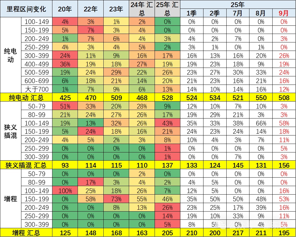 2025 年的增程车型的(纯电续航)里程相对较高,平均达到 205km。其中 150-250km 为主,9 月的 200-249km 的长续航快速增多。