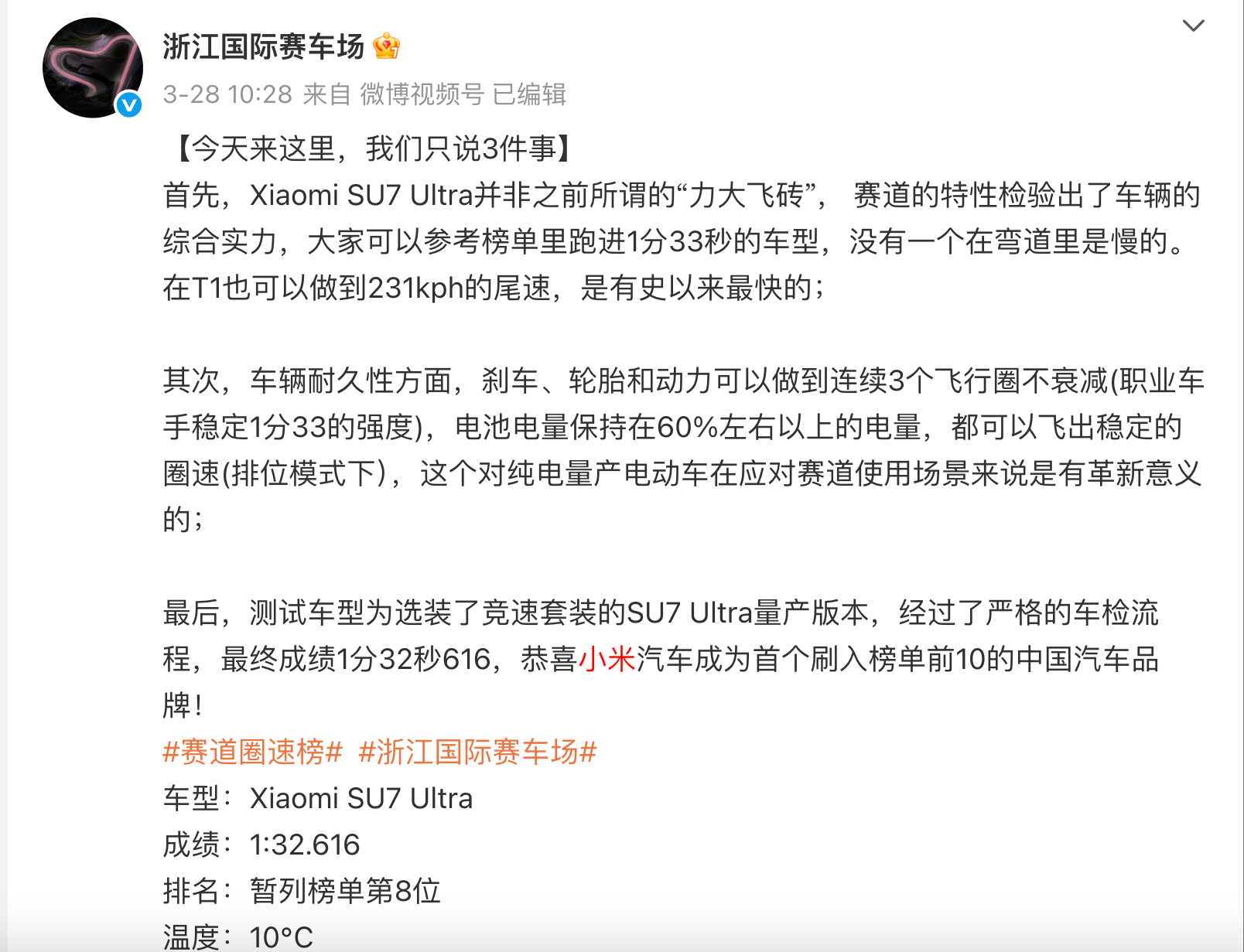 此前,Xiaomi SU7 Ultra成绩1分32秒616,暂列榜单第8位,成为首个刷入榜单前10的中国汽车品牌。