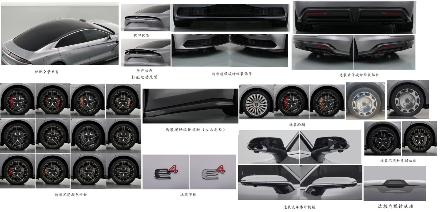 这款汽车将标配全景天窗、电动尾翼,可选装前保碳纤维装饰件、后保碳纤维装饰件、不同颜色卡钳、碳纤维侧裙板、字标、轮辋、不同材质制动盘、流媒体外视镜、内视镜底座,配有磷酸铁锂蓄电池,装置单体生产商为广西东盟弗迪电池有限公司,总成生产企业则为长沙弗迪电池有限公司。