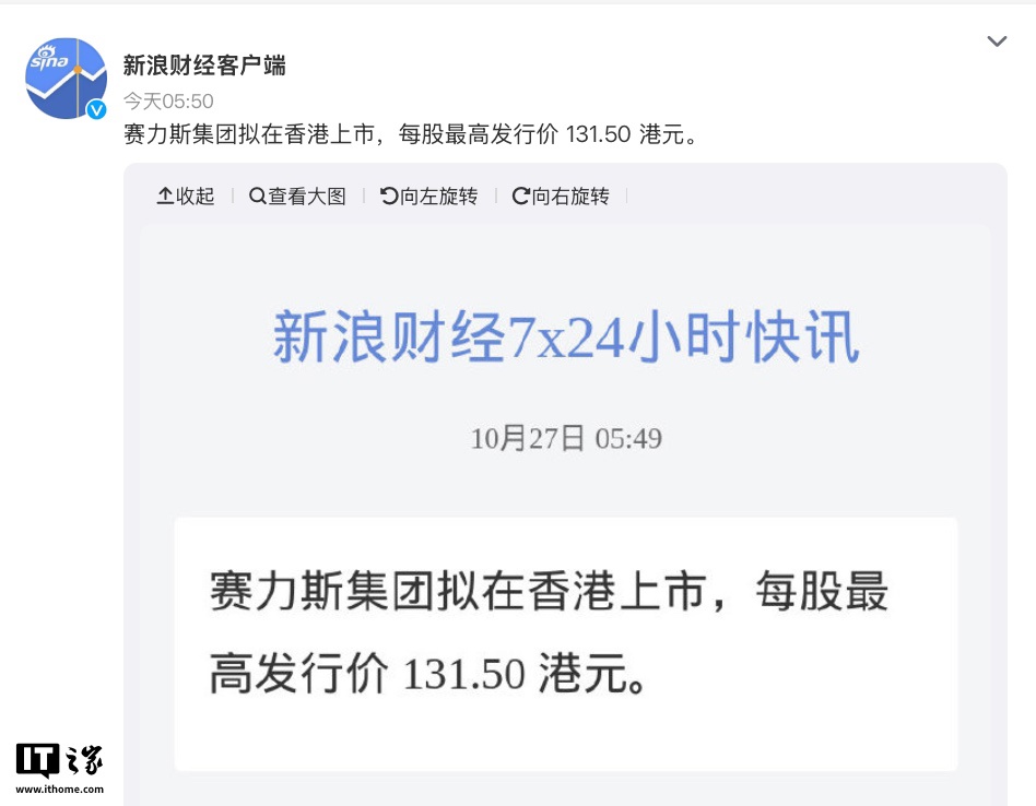 IT之家 10 月 27 日消息,据新浪财经,赛力斯集团拟在香港上市,每股最高发行价 131.50 港元,预计 11 月 5 日在香港开始交易。