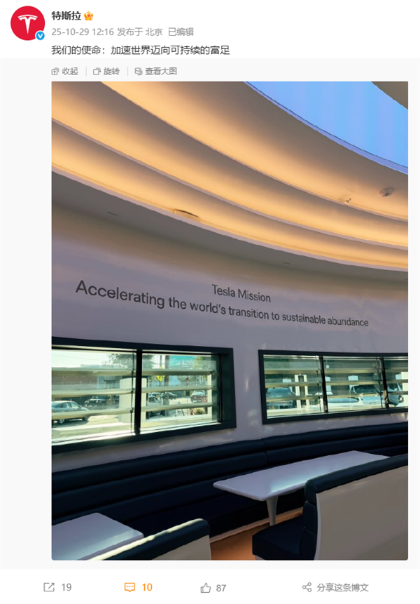 快科技10月29日消息,今天,特斯拉晒出办公室张贴的特斯拉使命:“Tesla Mission:Accelerating the world’s transition to sustainable abundance”