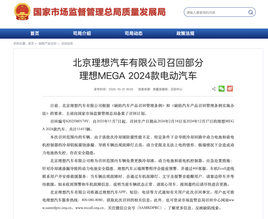 同日,国家市场监督管理总局官网也披露了《北京理想汽车有限公司召回部分理想MEGA 2024款电动汽车》的公告。