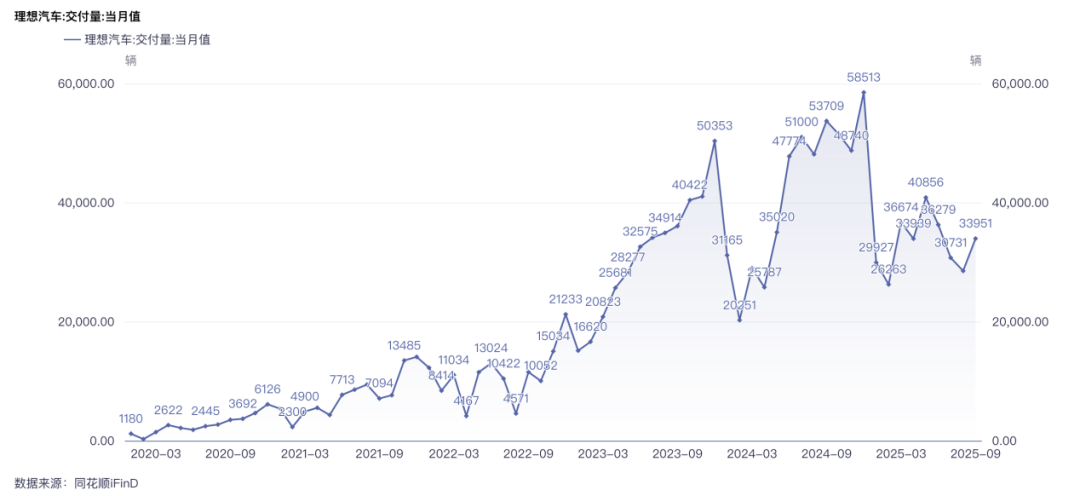 然而,在起火风波之余,理想汽车的市场表现更令人担忧。10月,理想汽车单月交付量仅为31767辆,同比大幅减少38.25%。这位曾经的新势力年度销冠,如今在交付数据上已落后于诸多同行。