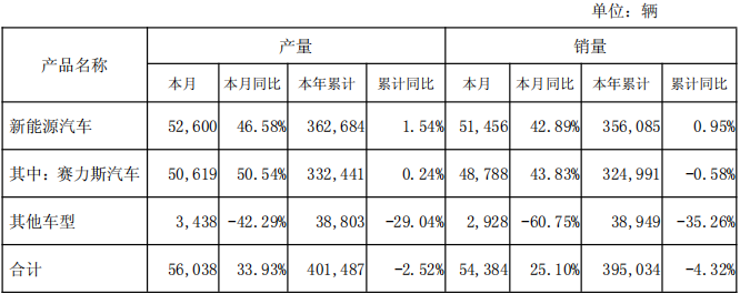 5、赛力斯10月销售汽车5.44万辆,同比增长25.1%