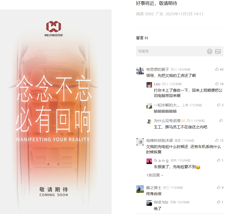 11月3日,威马汽车发文称:“好事将近,敬请期待!念念不忘,必有回响。”不过具体什么利好消息,威马汽车并未披露。