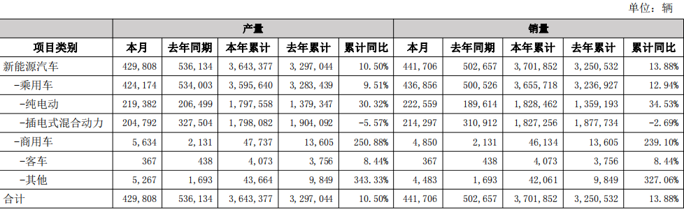 3、比亚迪10月销售汽车44.17万辆,去年同期为50.27万辆