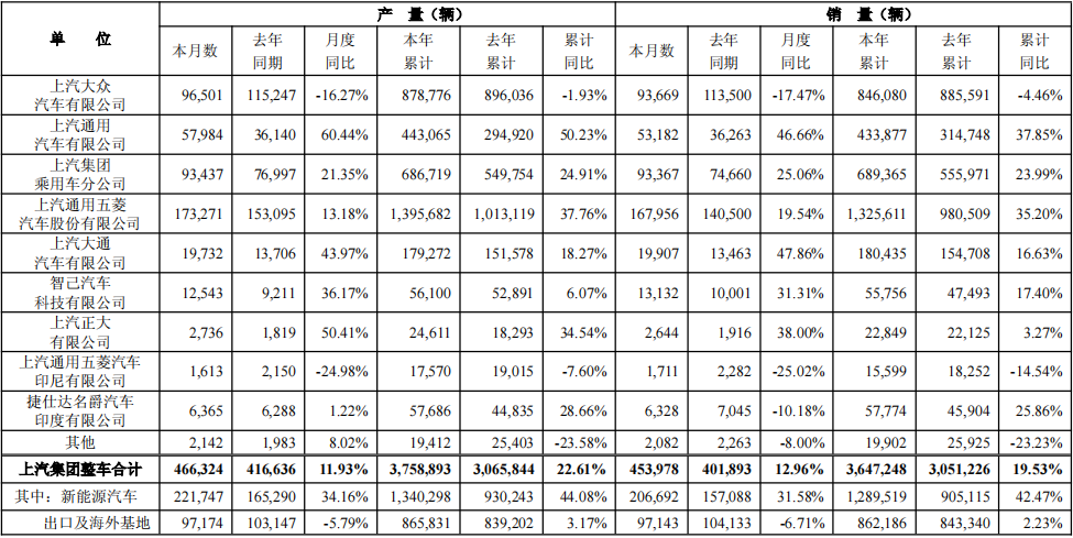 11月3日,上汽集团发布《2025年10月份产销快报》公告。10月整车合计产量为466,324辆,去年同期为416,636辆,月度同比增长11.93%;本年累计产量达3,758,893辆,去年累计为3,065,844辆,累计同比增长22.61%。