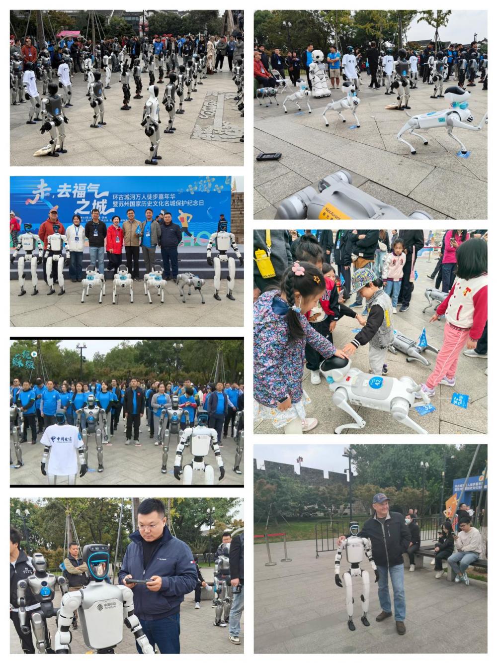 本次活动以“城为基、水为魂、步丈量”为主题,随着“走,去福气之城”的响亮口号,由苏州移动姑苏区分公司携手乐聚、鹿明、魔法原子等专业机器人企业共同组成的机器人方阵集结登场,规模达60个单元,成为全场焦点。姑苏区分公司现场展示了包括机器人、机器狗在内的7台智能设备。在互动环节,机器人流畅的行走、挥手动作吸引大量路人驻足观赏、合影;形态逼真、动作灵巧的机器狗更是备受青睐,其握手、互动、伸懒腰等萌态可掬的表演,深深吸引了现场观众尤其是小朋友们的目光,展区人气持续高涨。