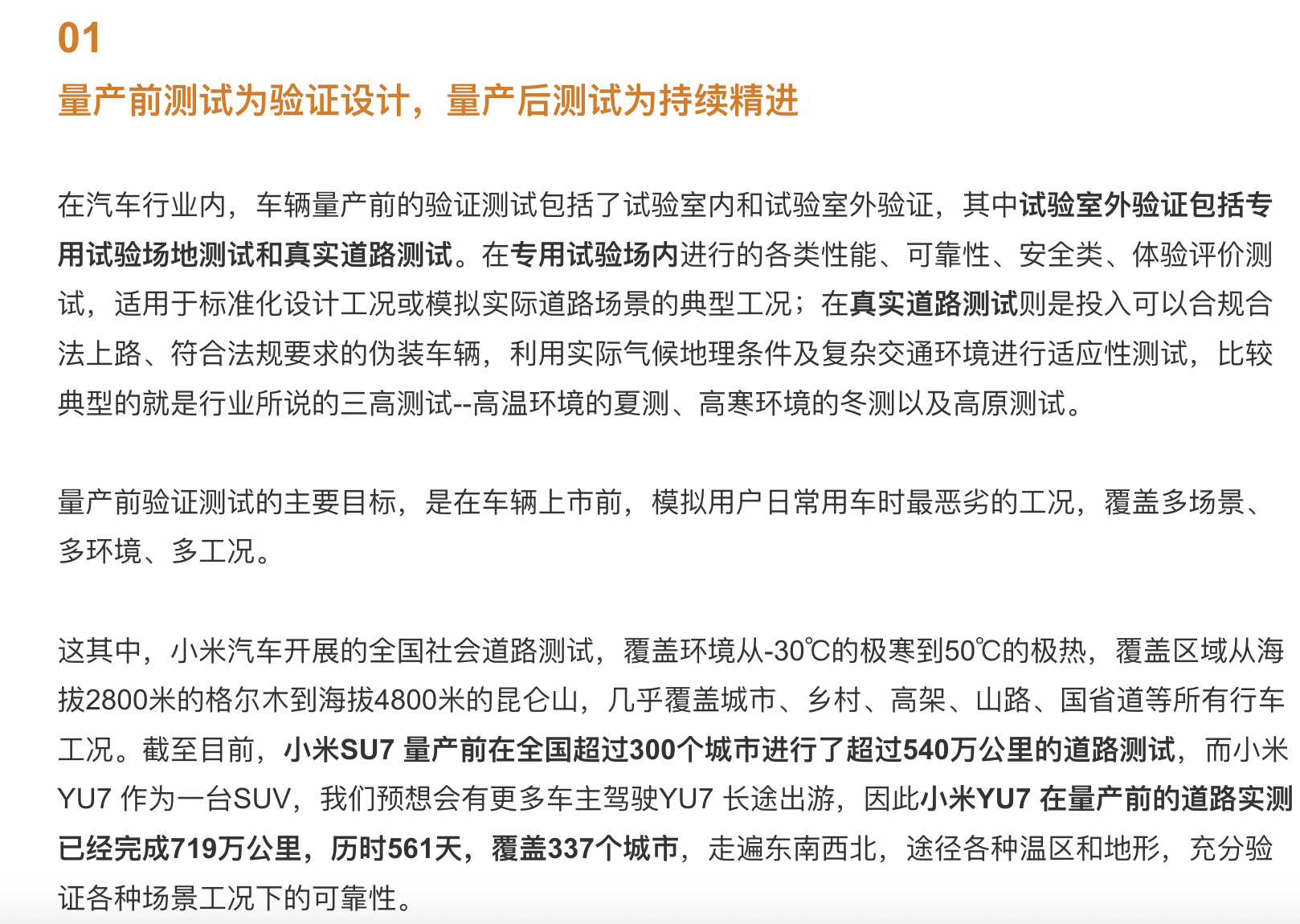 小米汽车官方文章里介绍,截至目前,小米SU7量产前在全国超过300个城市进行了超过540万公里的道路测试,小米YU7在量产前的道路实测已经完成719万公里,历时561天,覆盖337个城市。