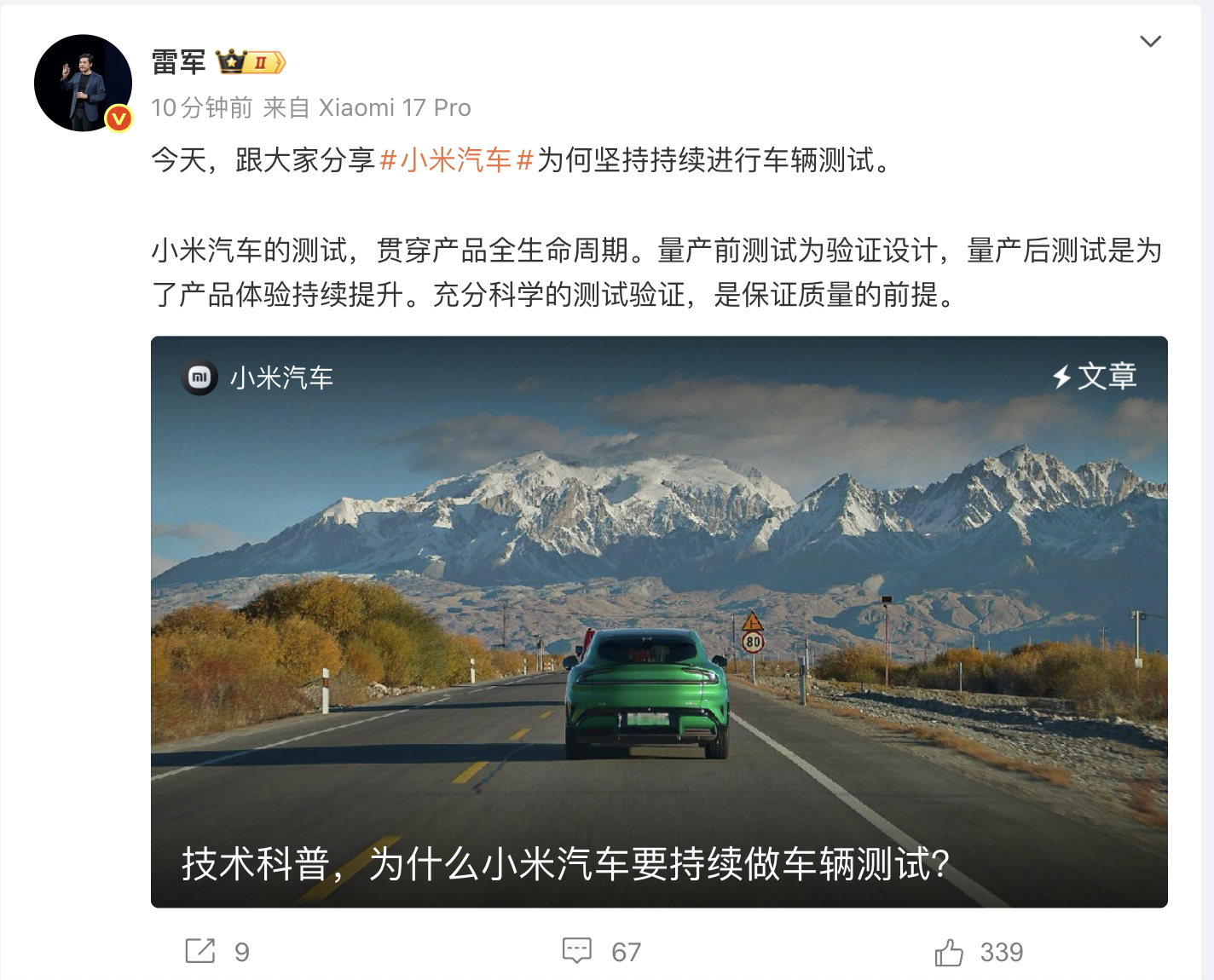 凤凰网科技讯 11月4日,小米创办人,董事长兼CEO雷军发文解释小米汽车为何坚持持续进行车辆测试。