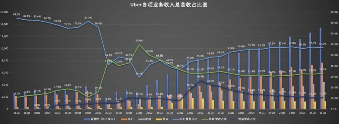 报告期内,优步配送业务表现亮眼,三季度配送业务订单额同比增长25%,较上季度的20%,增长5个百分点。