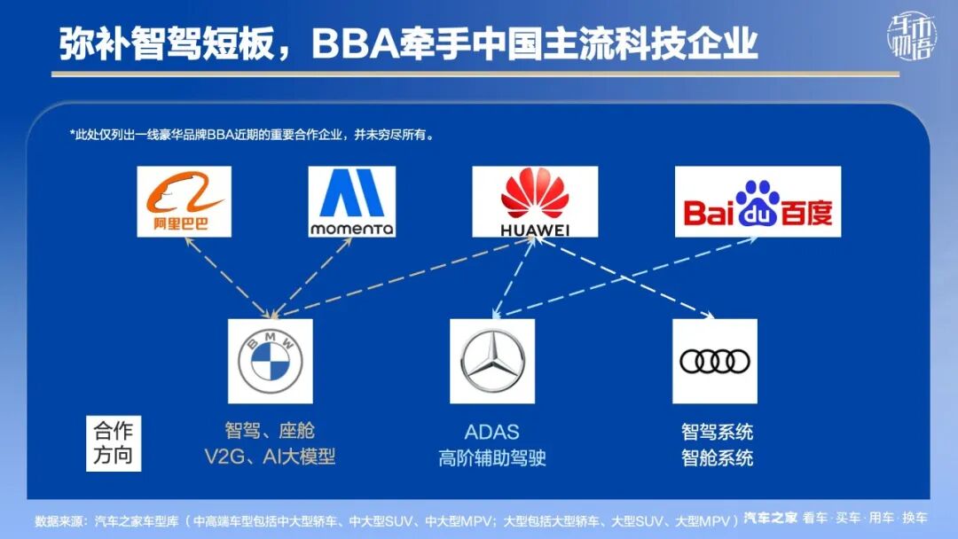 正视问题,才能解决问题。以BBA为例,虽然有些合作早就开启,但关于智能化领域的深度合作大都是2025年才开启。其中,奔驰与Momenta加大合作高阶智驾,2025年完成了四款新车型的上市。宝马与阿里巴巴于2025年3月启动了通义大模型智能座舱的合作,计划将于2026年上车。奥迪与华为开展合作,搭载ADS 3.0高阶智驾系统等等。