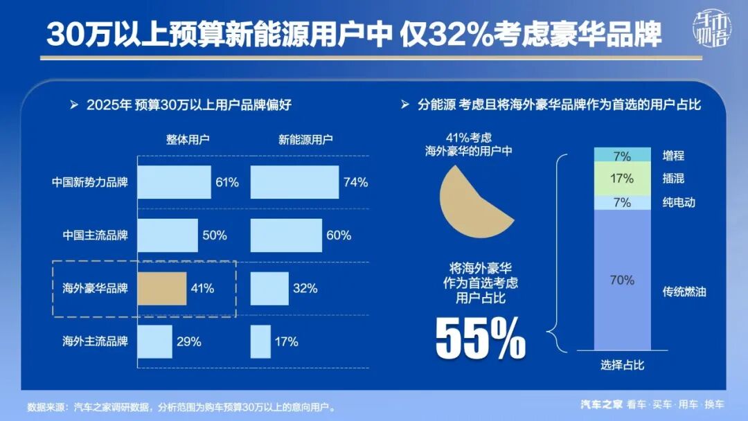 据汽车之家调研数据显示,购车预算30万以上的意向用户中,考虑购买海外豪华品牌的占比仅41%,这其中仅有55%的用户将豪华品牌作为首选考虑,剩下45%可能会随时“倒戈”。分能源偏好看,这些用户中七成考虑购买传统燃油车型,偏好纯电和增程的用户相对最少,均为7%。