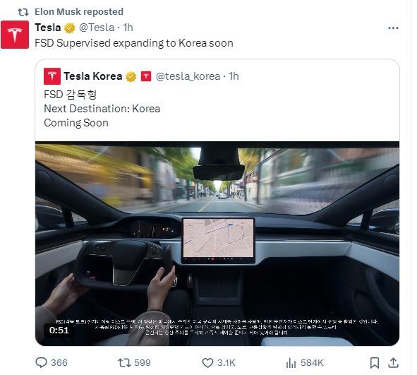 凤凰网科技讯 11月12日,特斯拉官方消息称,全自动驾驶(FSD)监督版将很快落地韩国。