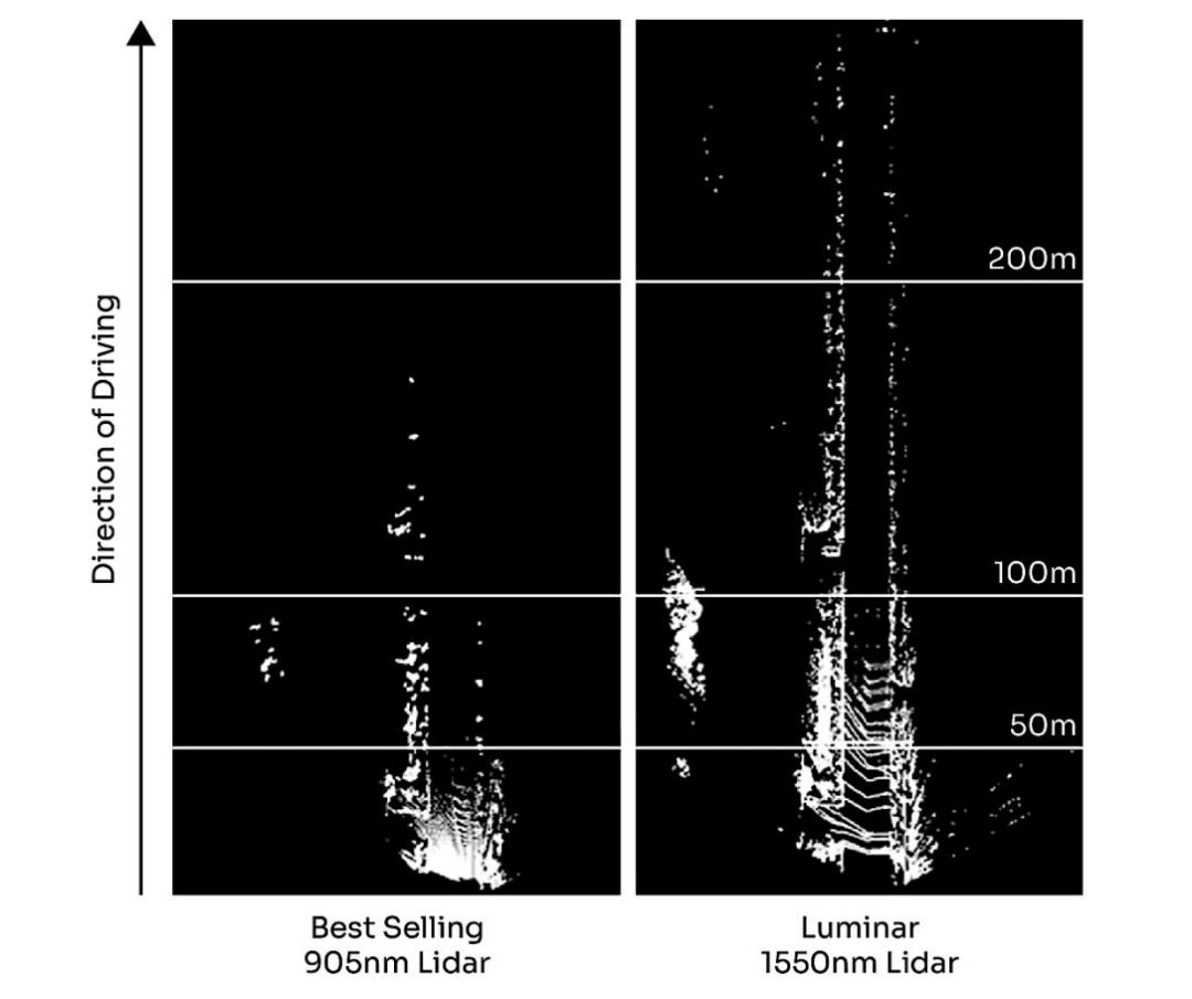 基于这个思考,在Luminar看来,波长超过 1200 纳米的激光器不但对眼睛更安全,而且可以向外界发射的光子数量是波长低于 1000 纳米(例如 905 纳米、940 纳米)激光器允许发射光子数量的 17 倍。这意味着 1550 纳米激光雷达的分辨率潜力是 905 纳米激光雷达的 17 倍,探测范围潜力是其 4 倍。这也促使他们选择了这个波段打造了激光雷达。
