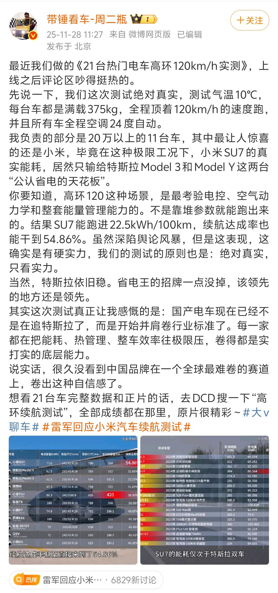 近日,有博主对21台热门电车进行了能耗测试,在气温10℃,满载375kg,全程120km/h时速且全程空调24度自动的条件下,小米YU7续航最长,420公里;小米SU7达成率最高,达到54.86%。但均不如特斯拉Model 3和Model Y的表现。
