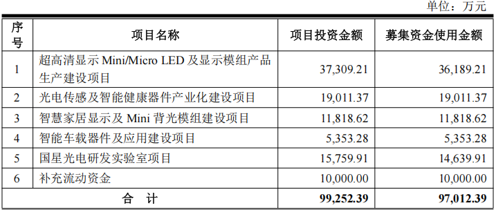 根据再融资招股书,国星光电计划募资9.7亿元投建超高清显示 Mini/Micro LED 及显示模组产品生产建设项目、光电传感及智能健康器件产业化建设项目、智慧家居显示及 Mini 背光模组建设项目、智能车载器件及应用建设项目、国星光电研发实验室项目及补充流动资金。