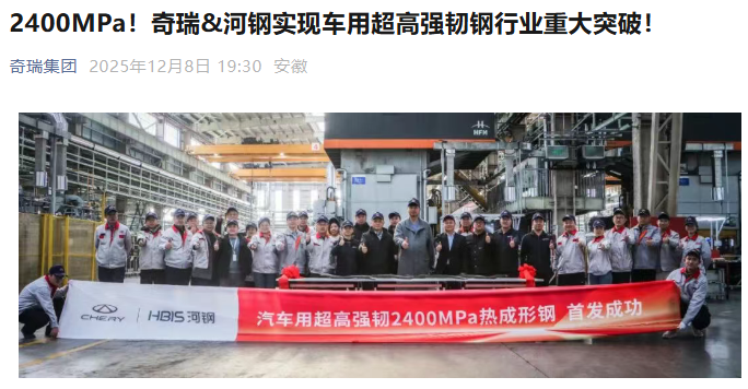 IT之家 12 月 8 日消息,据奇瑞集团官方,12 月 5 日,奇瑞汽车与河钢集团正式首发联合开发的汽车用超高强韧 2400MPa 热成形钢板。这一突破性成果,使中国汽车材料在超高强区间实现重要跃升,也展示出我国在关键基础材料研发上的持续提升与自主创新实力。