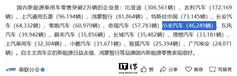 小米汽车官方并未公布具体的交付数据,不过在乘联分会今日公布的 2025 年 11 月份全国乘用车市场分析中,IT之家找到了其具体的销量情况,其中,小米汽车新能源乘用车零售 46249 辆、YU7 车型批发销量超三万辆(33729 辆)。