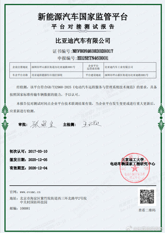 IT之家 12 月 17 日消息,比亚迪股份有限公司执行副总裁何志奇今日发文宣布,比亚迪成为国内首批获得“新能源国家监管平台符合性认证”的整车企业之一。