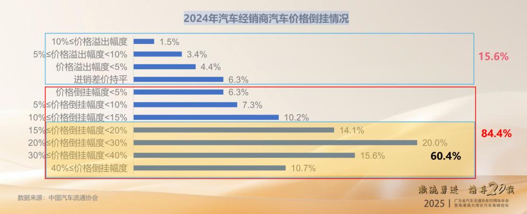 汽车经销商近两年的日子确实不好过。此前,中国汽车流通协会副秘书长朗学红提到,2024 年,有 84.4% 的汽车经销商有不同程度的价格倒挂,60.4% 的汽车经销商价格倒挂幅度在 15% 以上。虽然,当年汽车经销商亏损面较 2023 年有所收窄,但仅有 39.3% 经销商盈利。亏损经销商占比为 41.7%,持平占比为 19.0% 。