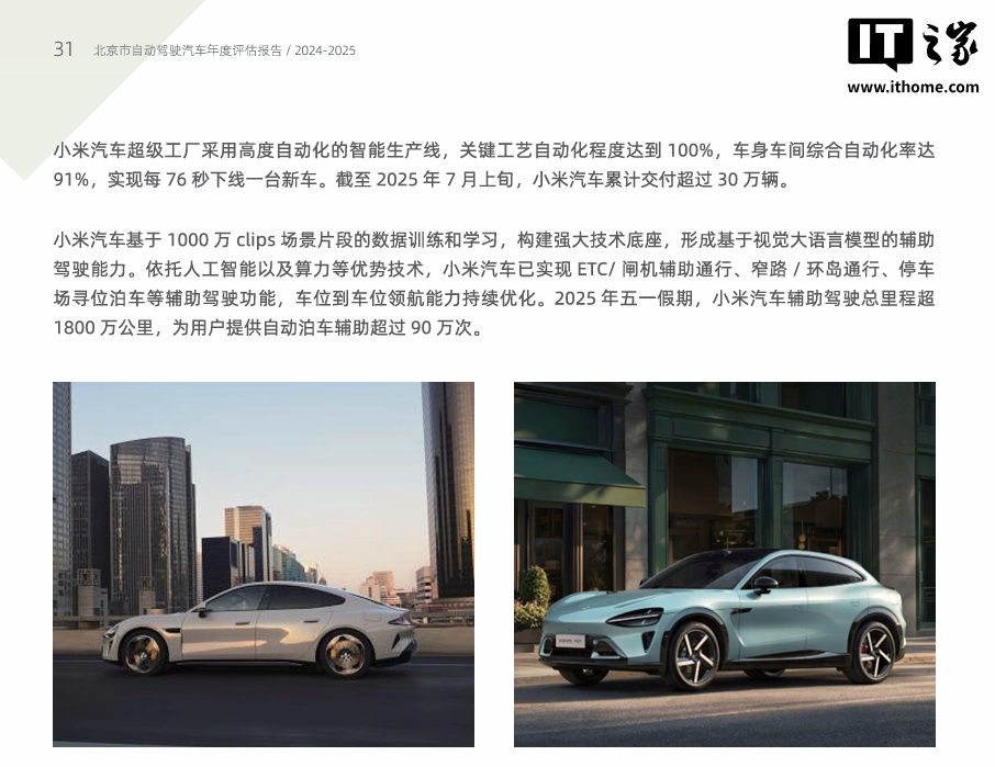 IT之家 12 月 19 日消息,据每日经济新闻今日报道,《北京市自动驾驶汽车年度评估报告(2024-2025)》(以下简称“报告”)中的信息显示,小米汽车已在北京市获得 L3 级自动驾驶道路测试牌照,并持续开展了常态化 L3 级道路测试。