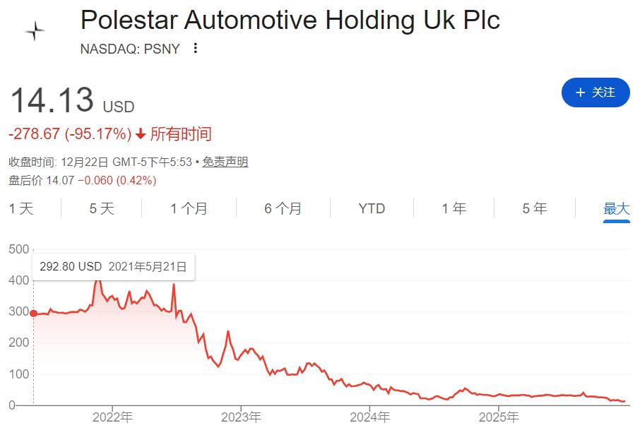 困扰极星的还有来自资本市场的压力,和今年年初相比,极星的股价已下跌约57%,和2021年登录纳斯达克时279美元的股价相比,已下跌超95%。