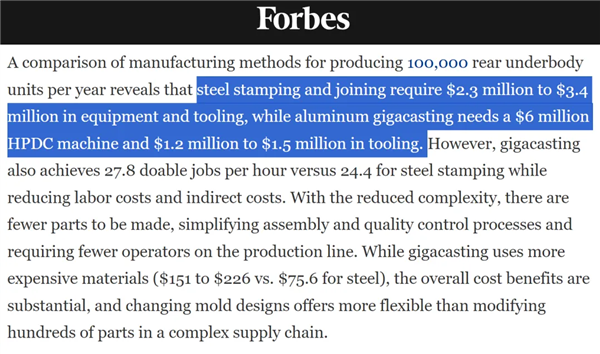 压铸零件供应商文灿股份曾经测算过,白车身焊接制造的成本在6300-8100元/台左右,如果是是压铸,成本在7000-8750元/台左右,并没有明显降低。