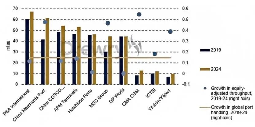“通港”层面的基建也齐头并进,去年以来由头部班轮公司掀起了一波港口码头的投资热潮,包括达飞、马士基、地中海航运都宣布了2026年港口投资扩建计划,过去5年全球港口的装卸量增长非常明显。