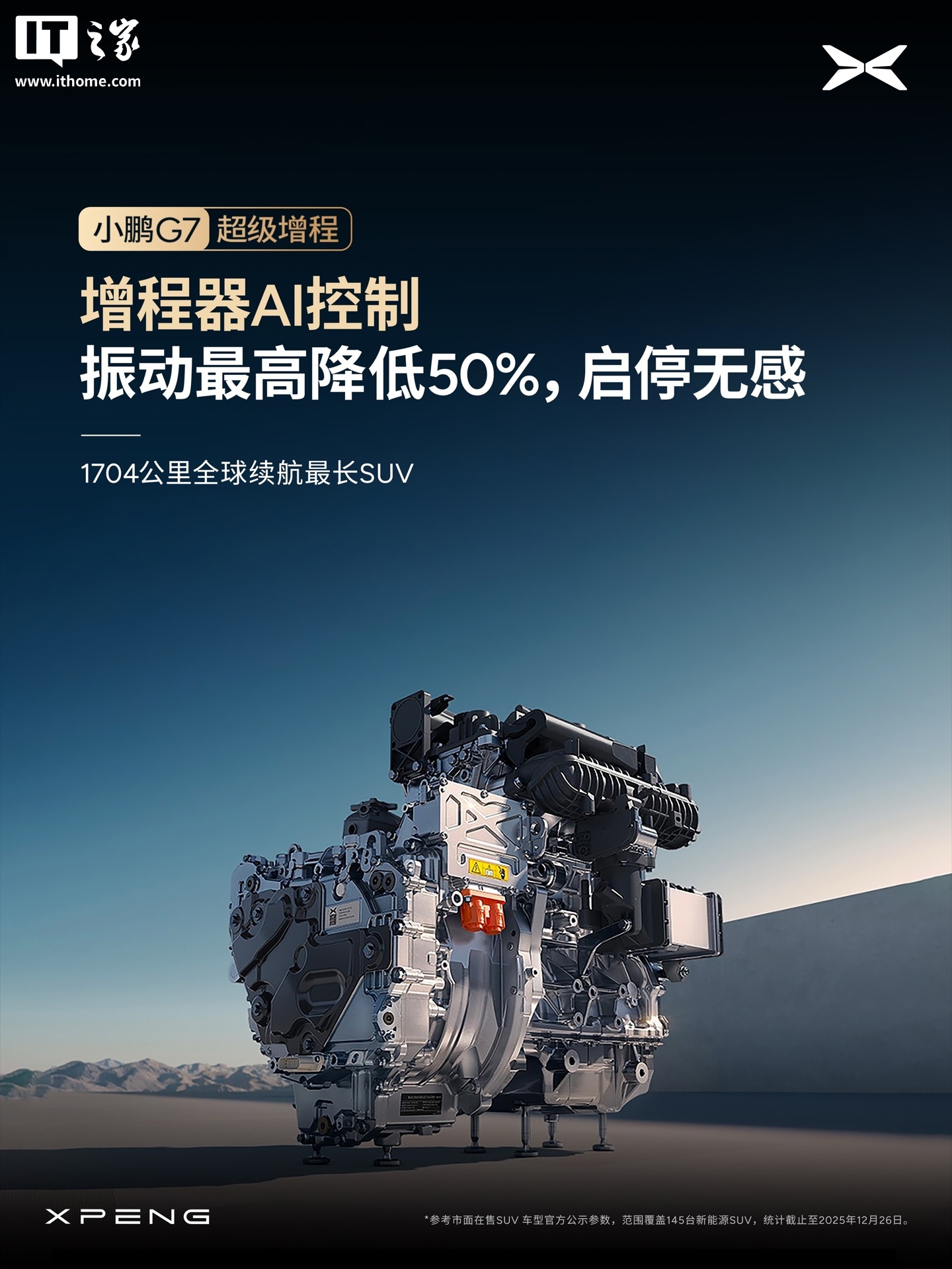 IT之家注意到,小鹏 G7 超级增程 SUV 是小鹏鲲鹏超级增程家族推出的首款 SUV 车型,官方表示新车把综合续航做到了全球最长的 1704 公里(55.8kWh 电池 + 60L 油箱,可加 92 号汽油),其拥有 430 公里纯电续航,配备同级唯一 800V + 5C 超充 AI 电池;搭载自研图灵芯片,有效算力 2250TOPS。