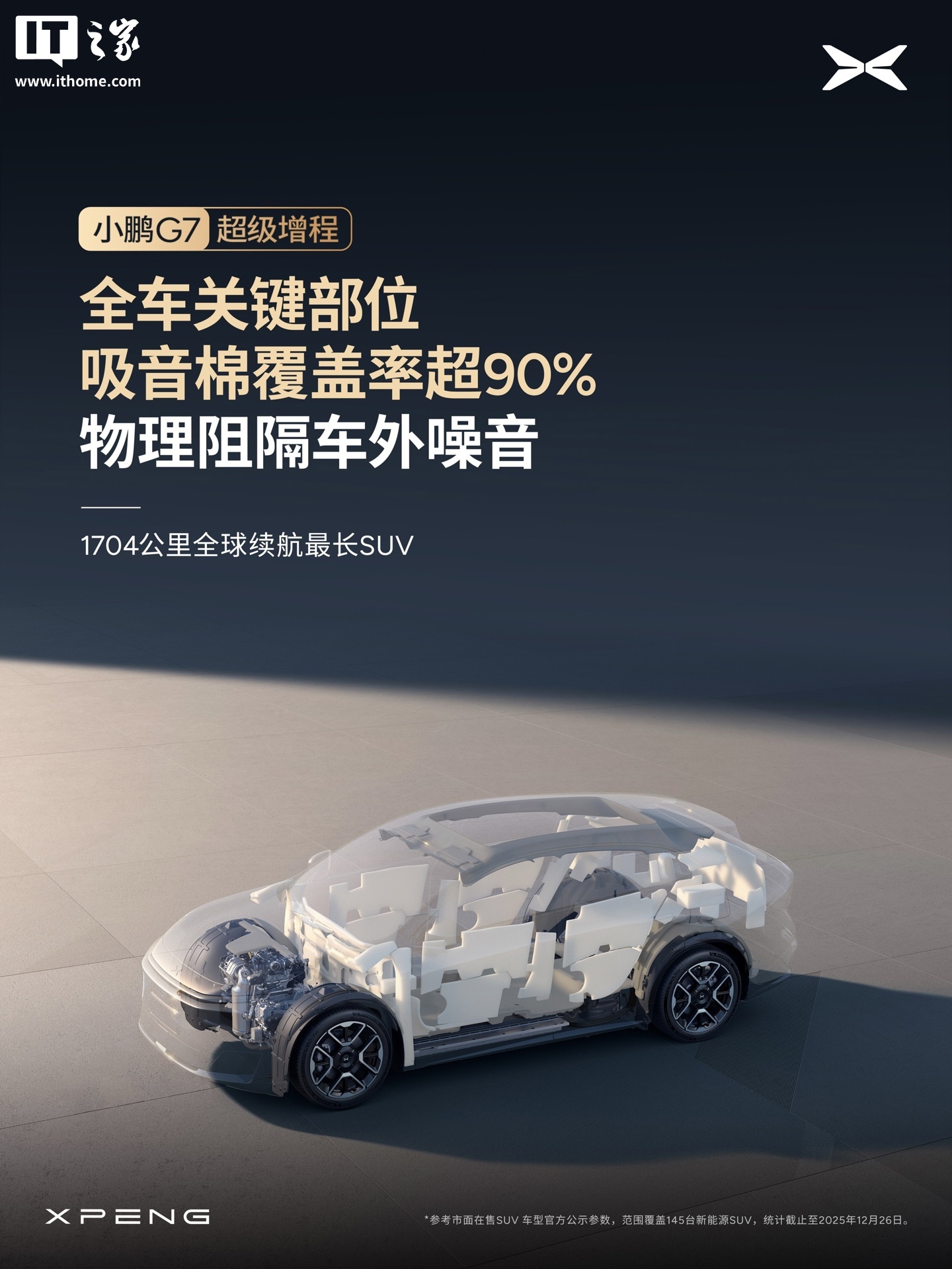 IT之家 1 月 5 日消息,小鹏汽车官方今日继续预热 G7 超级增程 SUV,本次着重介绍了新车的降噪能力。据介绍,小鹏 G7 超级增程全系标配主动降噪技术 ENC+RNC,噪音最高降低 50%。
