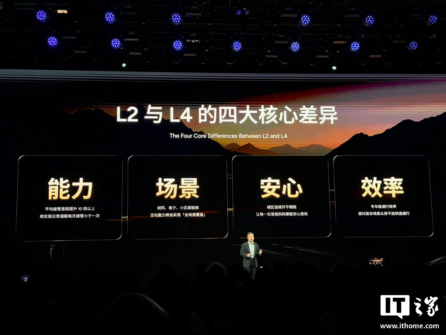 IT之家从发布会现场获悉,何小鹏还谈到了 L2 与 L4 的四大核心差异: