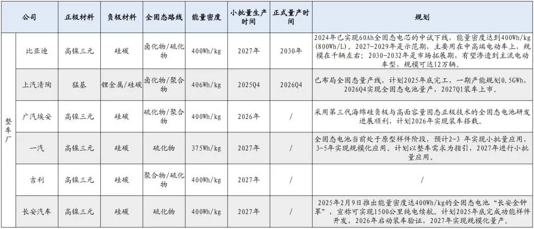 上汽清陶预计2025年投产,目标能量密度406Wh/kg,2027年装车上市。一汽、吉利、长安也是计划2027年小批量装车。