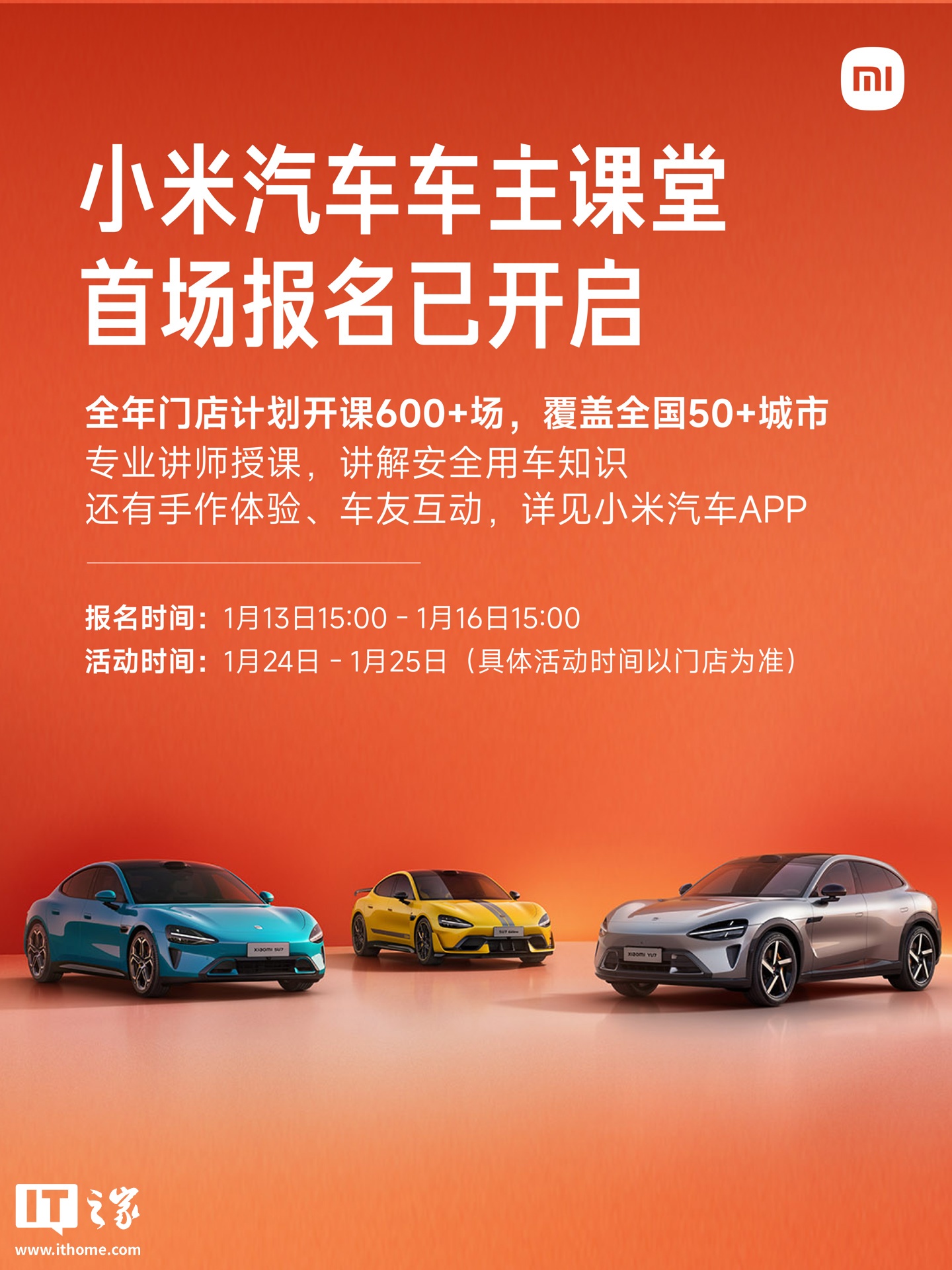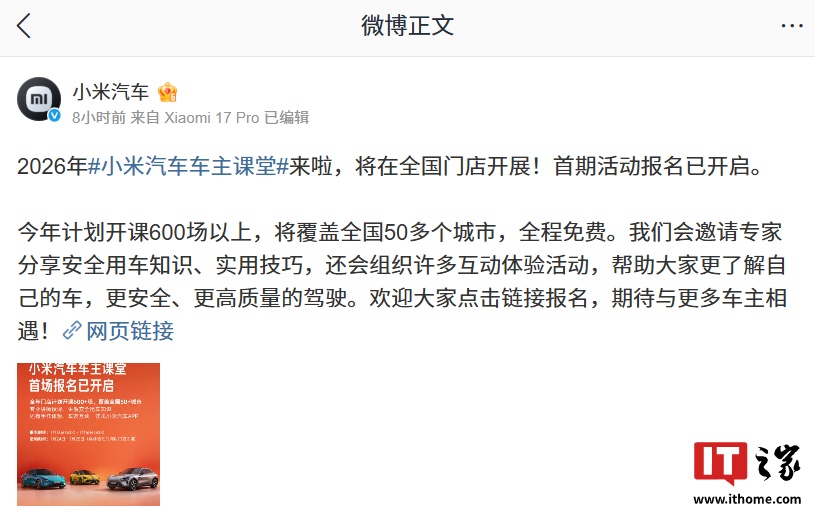 IT之家 1 月 13 日消息,小米汽车官方微博今日宣布,2026 年小米汽车车主课堂将在全国门店开展,首期活动报名已开启。