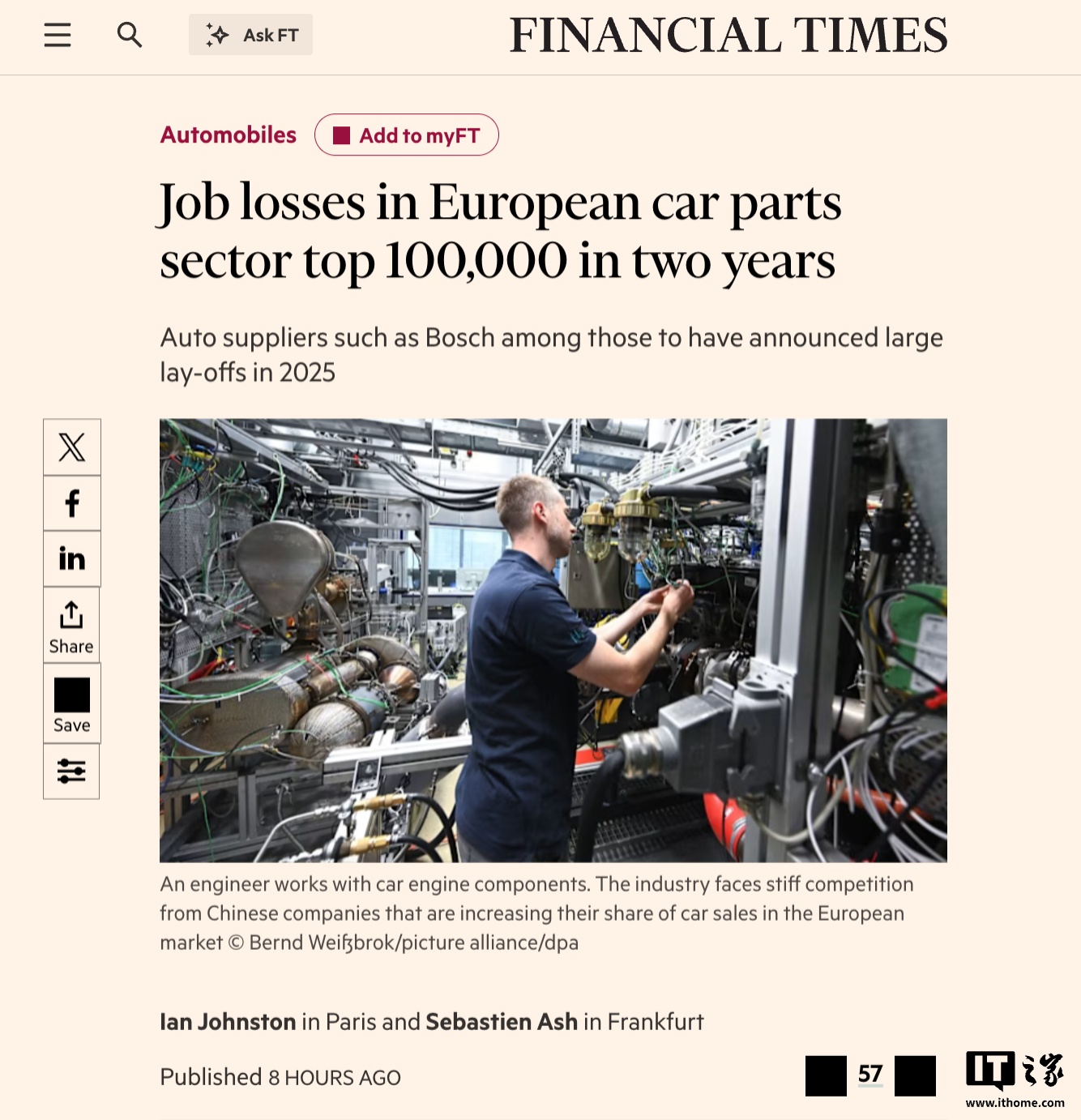 IT之家 1 月 14 日消息,当地时间 1 月 13 日,据英国《金融时报》报道,欧洲汽车零部件行业的裁员潮仍在扩大。