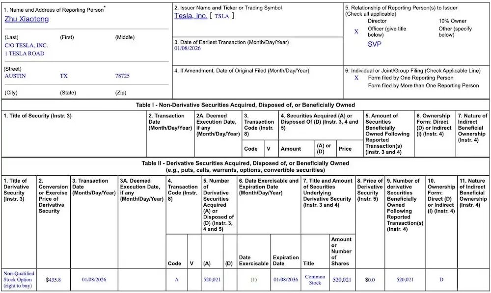 车东西1月14日消息,日前,特斯拉美股发布公告,将高级副总裁朱晓彤的任期合同延长五年,同步授予其520021股特斯拉限制性股票单位,其行权价为435.8美元(约合人民币3040元)。