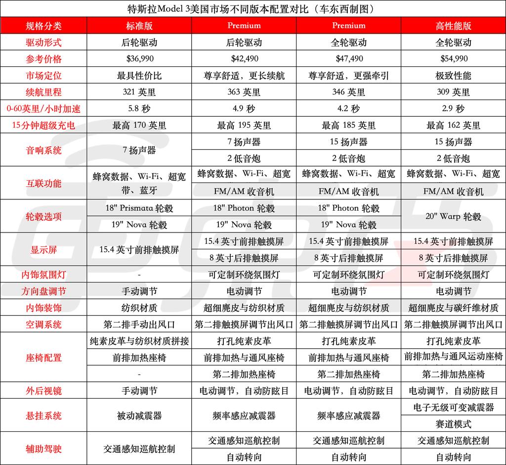 ▲Model 3美国市场不同版本对比