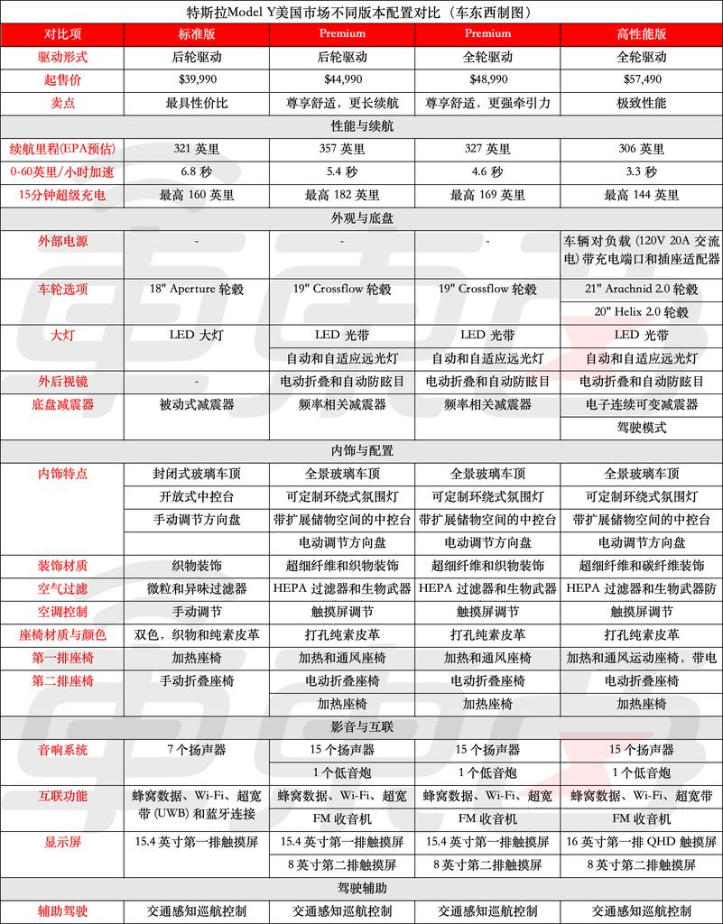 ▲Model Y美国市场不同版本对比