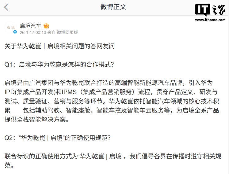 IT之家 1 月 17 日消息,由广汽集团与华为乾崑联合打造的高端智能新能源汽车品牌“启境”,今日进一步对外阐释了其与华为旗下的智能汽车解决方案品牌“华为乾崑”之间的具体合作模式。