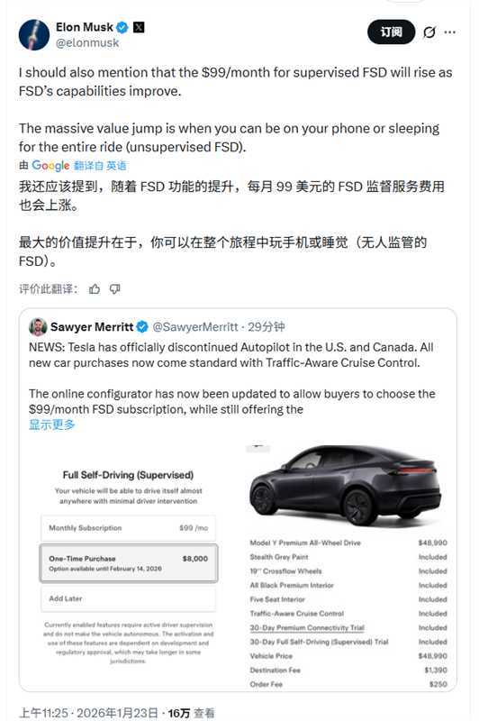1月23日,特斯拉CEO埃隆·马斯克在X上表示,特斯拉全自动驾驶(FSD)功能的巨大提升在于,整个驾驶旅程中人们可以一直玩手机或者睡觉。马斯克还提到,随着功能提升,每月99美元(现汇率约合691元人民币)的FSD订阅价格将会上涨。
