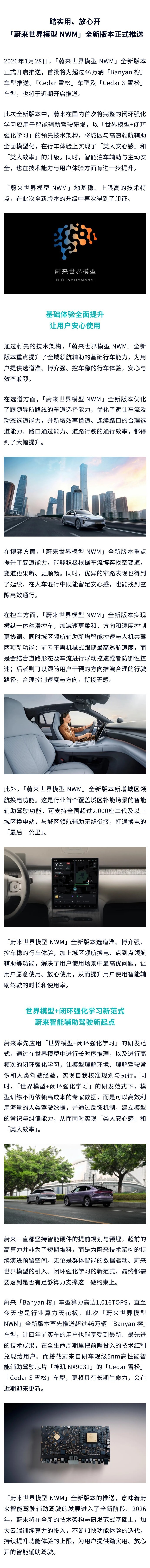 蔚来强调,其超前预埋的高算力硬件(如Banyan平台算力达1016TOPS)为持续软件升级提供了基础。搭载自研5nm智驾芯片NX9031的Cedar系列车型,正陆续获得最新技术赋能。马麟亦在微博邀请用户到店体验最新版本世界模型,并积极反馈建议。