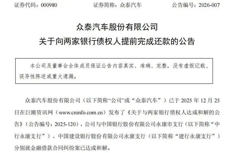 1月26日,众泰汽车发布关于向两家银行债权人提前完成还款的公告。公告表示,众泰汽车截至公告日已偿还中行永康支行剩余债务2.12亿元,建行永康支行剩余债务1.72亿元。根据调解约定,众泰汽车对中行永康支行、建行永康支行的债务偿还责任已分别履行完毕。
