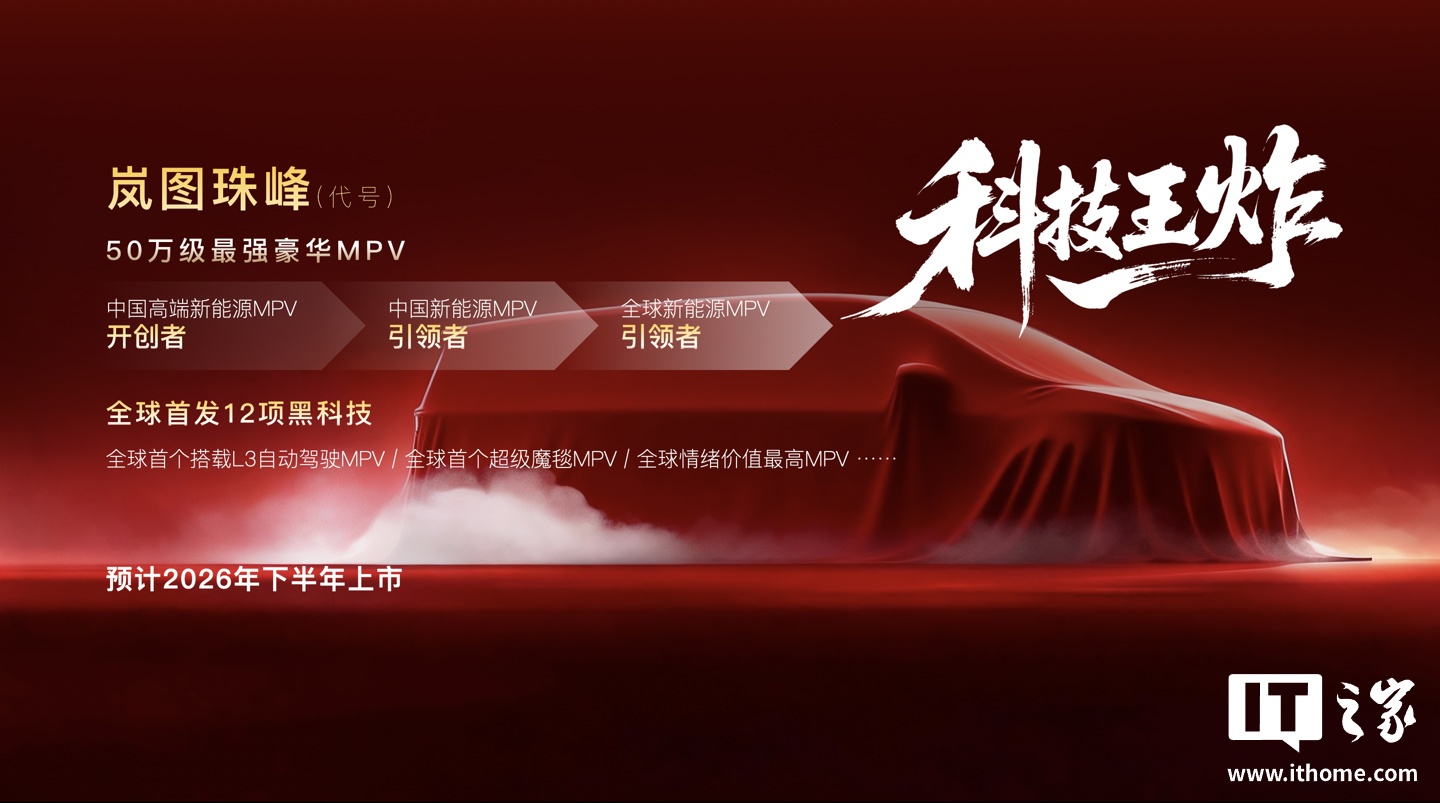 IT之家 1 月 28 日消息,岚图汽车 CBO、销售公司总经理邵明峰今日预告了 2026 年的四款全新车型,包括中国首款量产 L3 级 SUV 岚图泰山 Ultra、大五座 SUV 岚图泰山 X8,代号为“FE”的全新 FUV,以及代号为“珠峰”的 50 万级 MPV,宣称“三王一炸”。