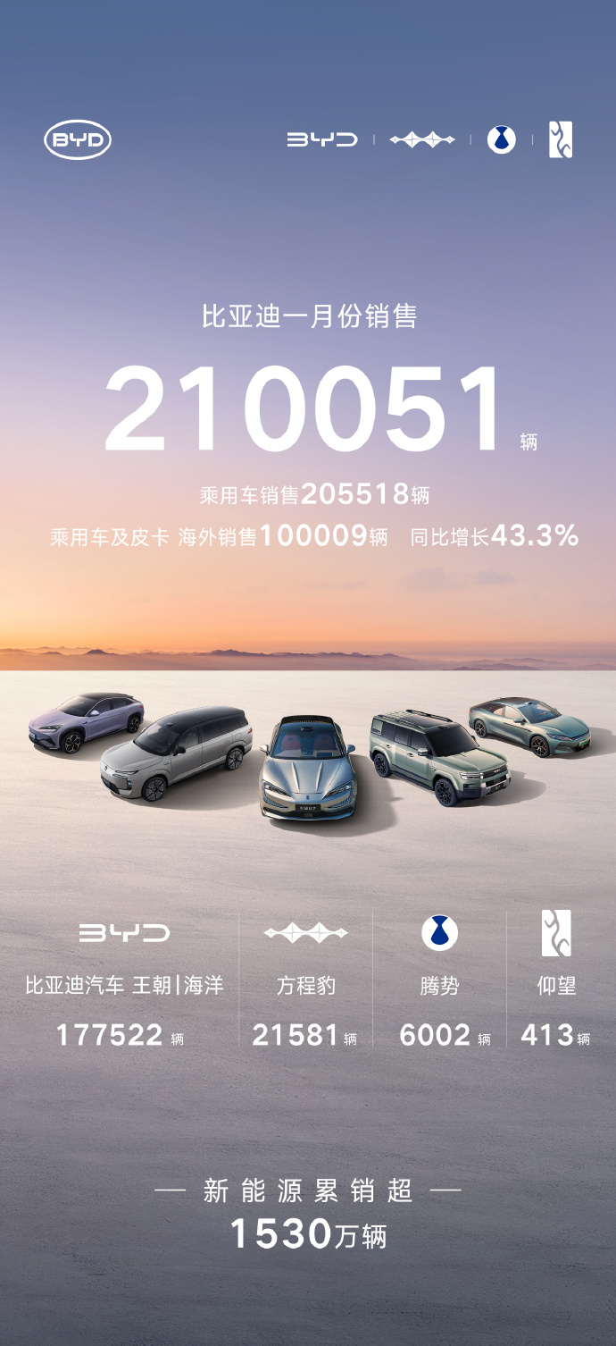 2月1日消息,比亚迪公布了2026年1月汽车销量数据。
