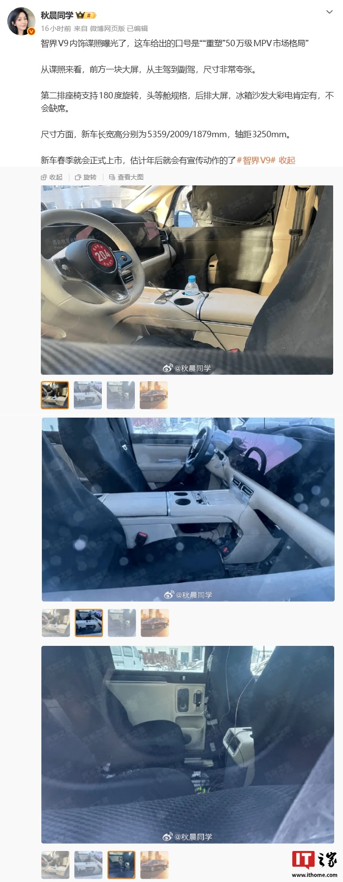 据IT之家今日早些时候报道,博主 @秋晨同学 分享了鸿蒙智行智界 V9 旗舰 MPV 内饰谍照。画面显示,该车采用最新三联屏设计,前方一块大屏,从主驾直接延伸到副驾;方向盘采用标准样式设计,更适合 MPV 的驾驶习惯。
