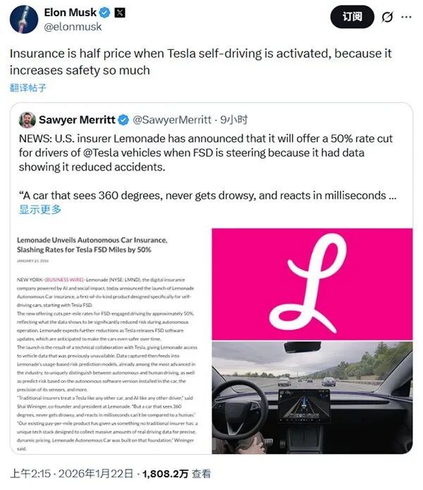 Lemonade联合创始人兼总裁沙伊·温宁格表示:“FSD能够360°观察环境、从不犯困、具备毫秒级的反应速度,事故率也显著低于人类驾驶员。”
