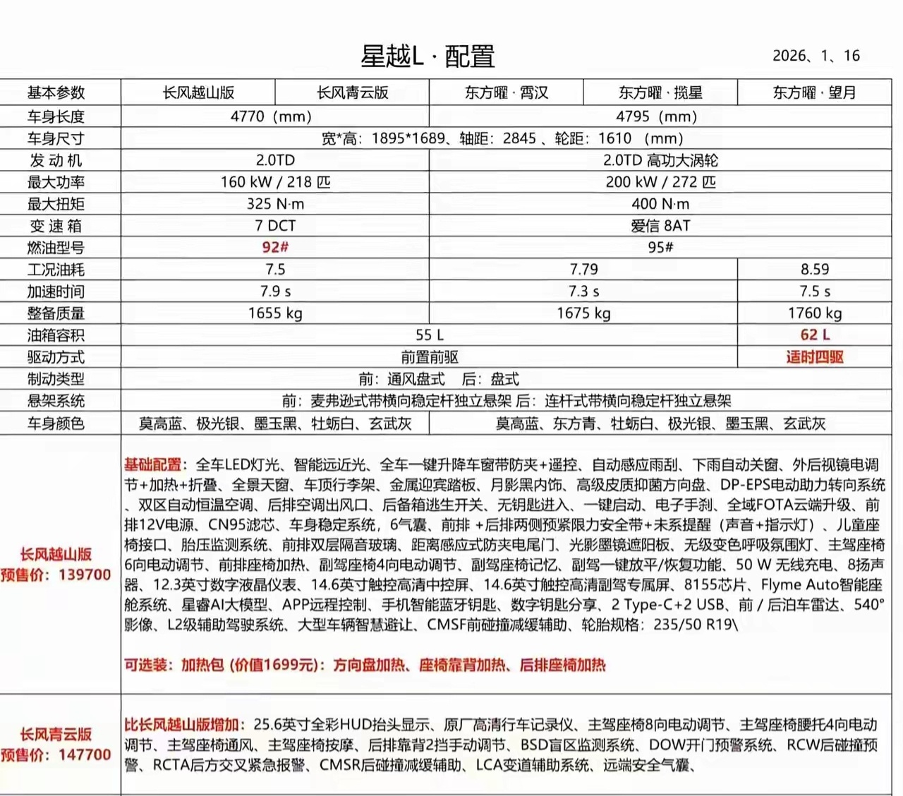 其中,青云版额外配备 HUD 抬头显示、行车记录仪及座椅通风 / 按摩功能。两版本均支持选装前排 / 二排座椅加热包,并新增手机无线充电、多层隔音玻璃等配置。