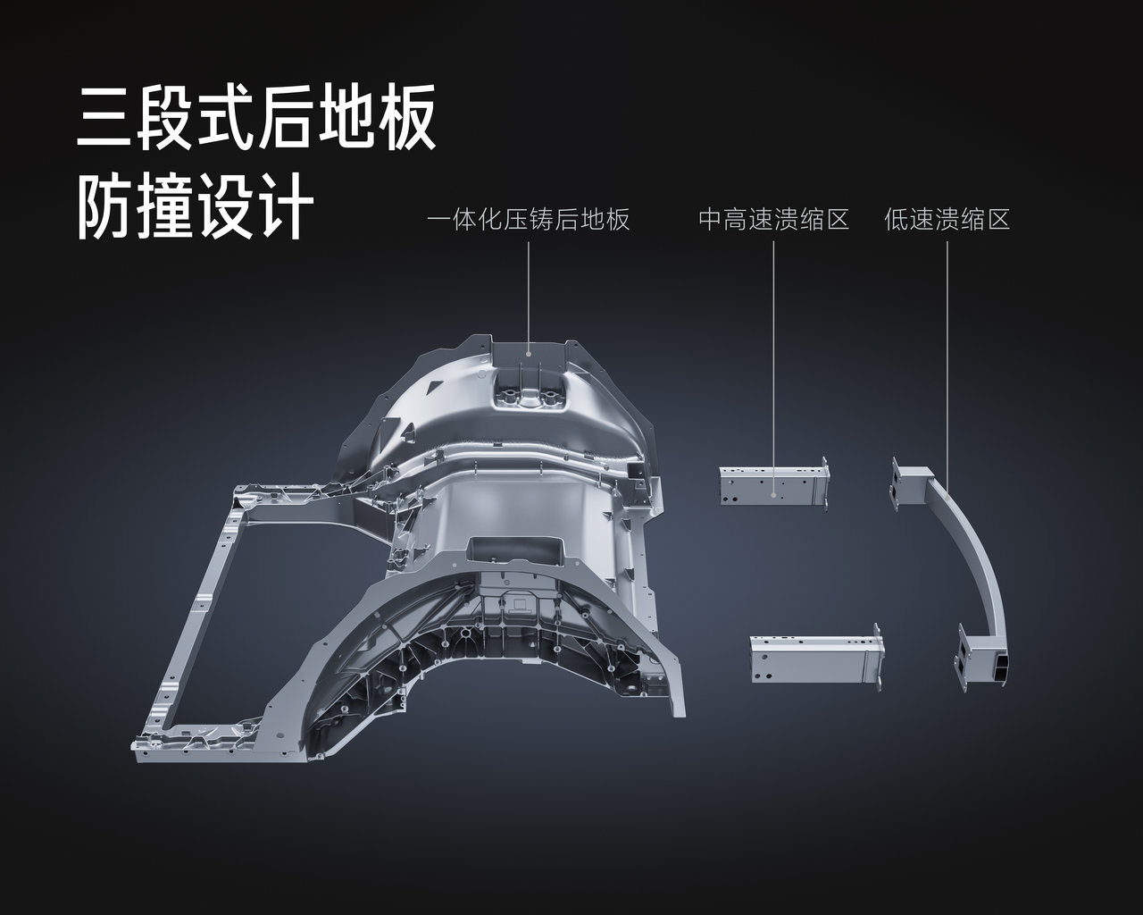 小米泰坦合金用于后地板大铸件,在高速或超高速追尾时能够很好地保障乘员舱完整性。